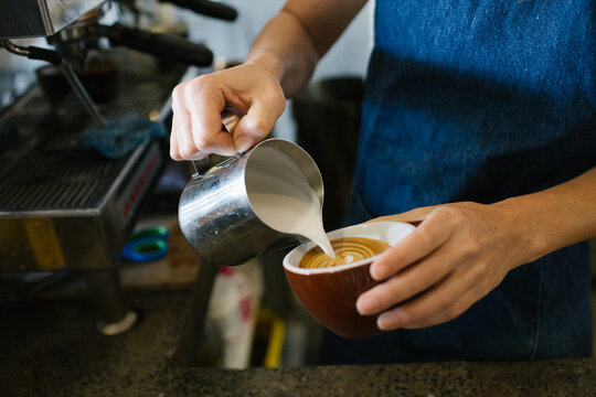 Close up shot of a man's holding a cup of coffee also pouring milk in a tin mug to the coffee