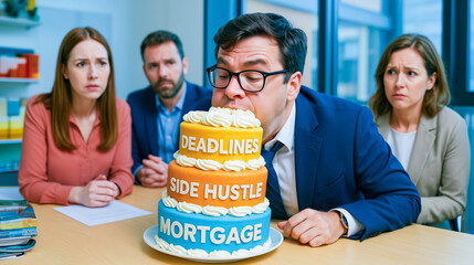 Man biting cake with stressful messages surrounded by concerned colleagues in office. Bite off more than you can chew - a concept of taking on too much, miscalculate your strength