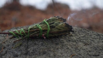 Slow burning smudge stick on a rock in the forest