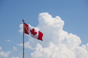 A Canada flag flying in a blue sky with cloud; Prince Edward Island, Canada