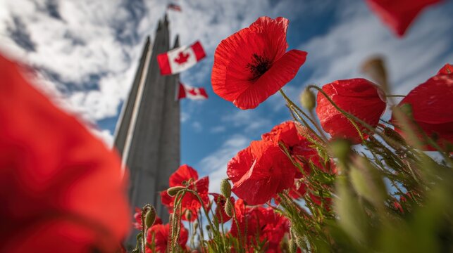 Canadian remembrance tribute with red poppies and flags under blue sky