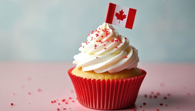 Celebratory Canada Day cupcake features white frosting. A small Canadian flag decorates the sweet treat. Red sprinkles add a festive touch for a national holiday party. Ideal for bakery promotions.