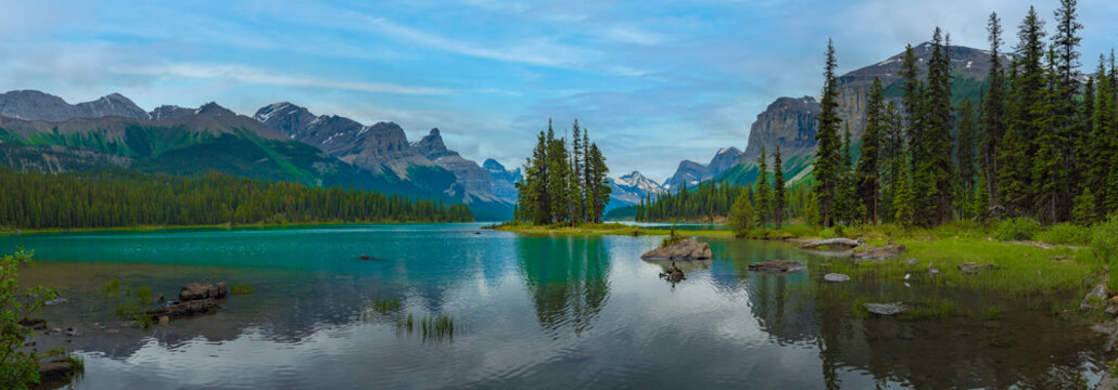 Panorama Canada forest landscape of Spirit Island with big mountain in the background, Alberta, Canada.