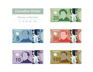 Canadian Dollar Vector Illustration. Canada money set bundle banknotes. Polymeric money 5, 10, 20, 50, 100 CAD. Flat style. Isolated on white background. Simple minimal design.