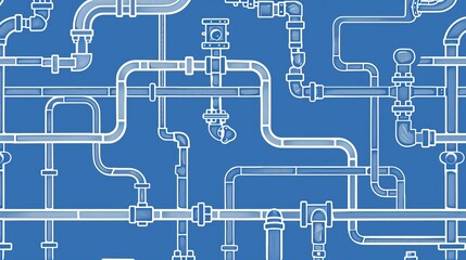 Horizontal industrial seamless pattern: white piping on a blue background for water, gas, oil. Illustration in line art style.