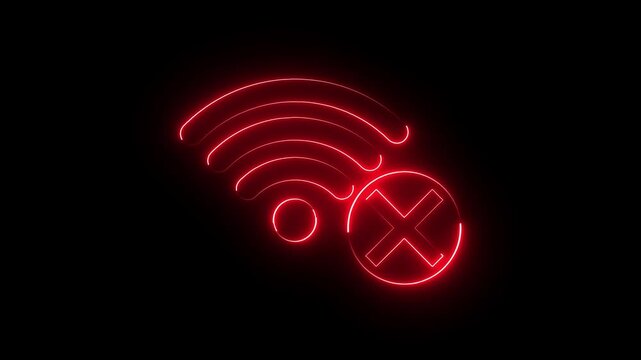 WIFI with no signal icon animation glowing neon red color cross wrong cancel wireless internet device info mobile phone and computer router networking sign symbol on black background