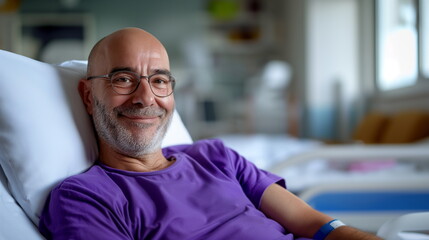 Bald man resting in hospital bed. Smiling male cancer patient in purple t-shirt and glasses. Portrait of a male cancer survivor. Hope, victory over disease, cancer awareness concept.