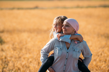 A woman with cancer is sitting in a wheelchair. She walks on the street with her daughter and they fool around.