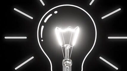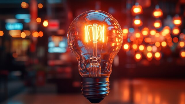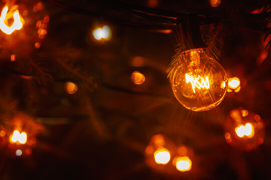 Close up view of an illuminated incandescent light bulb with glowing tungsten filament in the dark