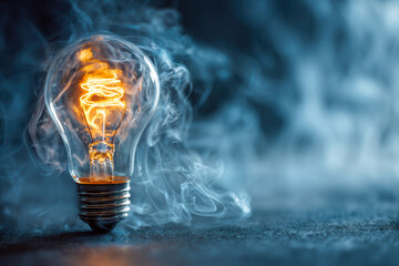 Glowing incandescent light bulb surrounded by swirling smoke against a dark blue background symbolizing creativity and innovation concepts