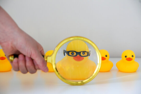 magnifying glass over employee portraits, highlighting one person, symbolizing selection or recruitment