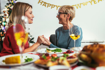 Mother and daughter having great time at Christmas dinner
