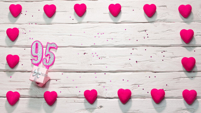 Beautiful anniversary background happy birthday with a cupcake and a burning candle. Happy birthday anniversary on wooden background with decorations with number 95