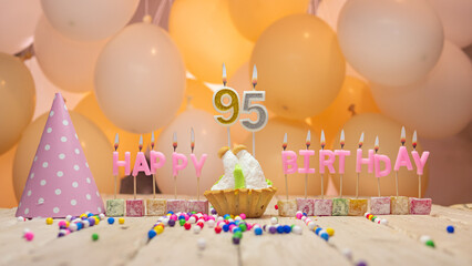 Beautiful background happy birthday number 95 with burning candles,birthday candles pink letters for ninety five years. Festive background with balloons