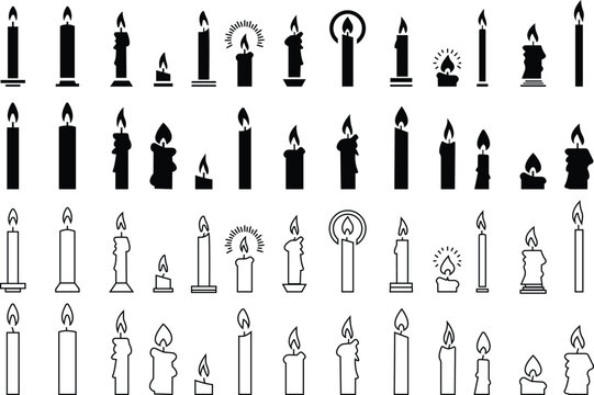Set of Black linear candle silhouettes for religion commemorative and party icon. Candles flaming flat symbol collection. Candle icon. Vector Illustration.