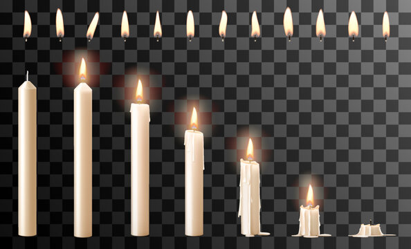Set of realistic white burning candles and fire flames with wick different shapes isolated on transparent background. Realistic burning candles for animation. 3d vector illustration.