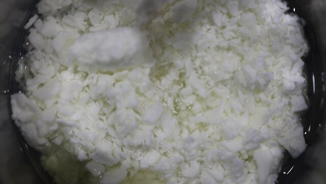 Creative occupation of candle making. woman making candles from soy wax, working in her creative space. mixing soy wax flakes