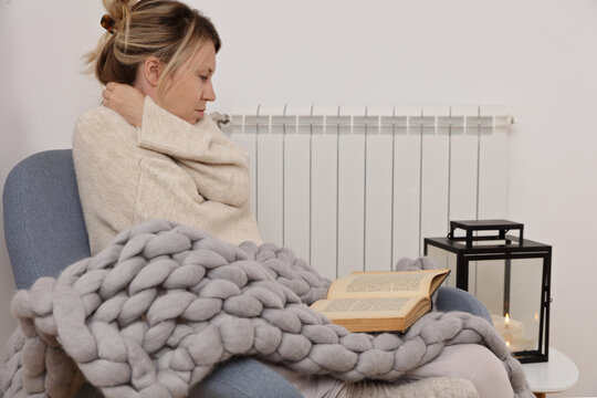 Led light bulb and calculator on blue background with space for text. Energy efficiency of led light lamp concept.