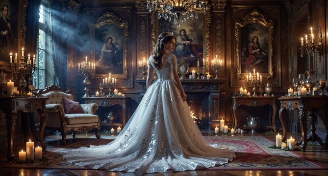 elegant bride in a ballgown standing in a vintage room illuminated by candlelight and dramatic light beams.