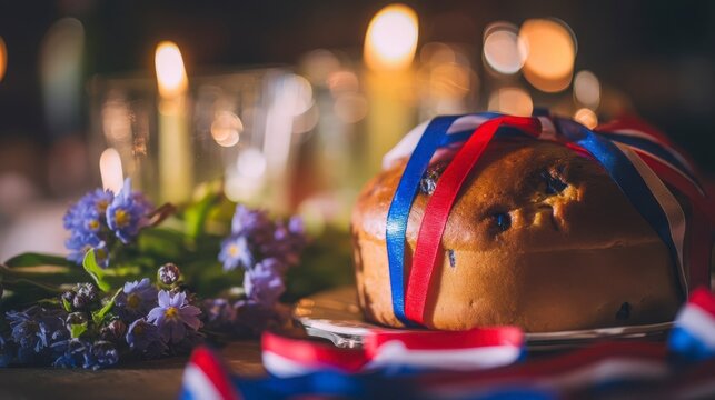 Traditional Slovenian potica cake with festive ribbons, glowing candlelight, alpine wildflowers; celebrating national pride and heritage.