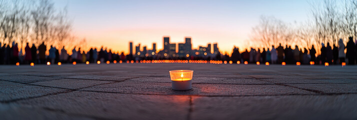 candlelit vigil at sunset, with people gathered in remembrance, creating serene atmosphere