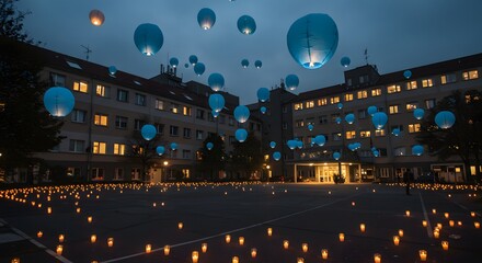 A candlelit vigil of blue paper lanterns floating above an empty hospital courtyard at dusk.