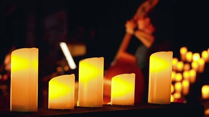 LED candles in the foreground and a blurred musician with double bass in the background. The warm glow creates an intimate atmosphere for a candlelit concert