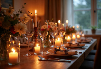 A candlelit dining room set for a romantic evening dinner