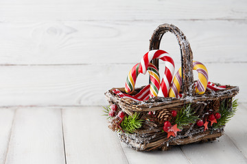 Christmas wicker basket with striped candy canes on white wooden table, festive decoration