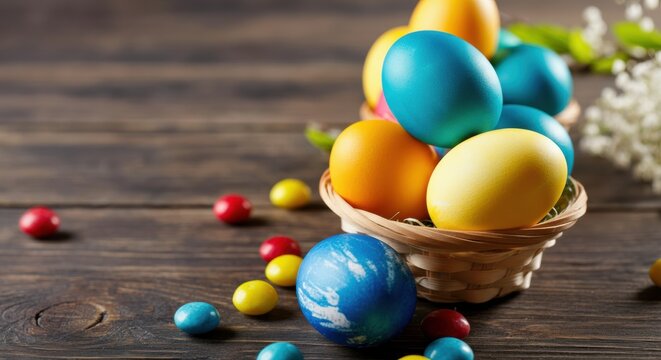 Easter eggs in a woven basket on a rustic wooden table with scattered candy