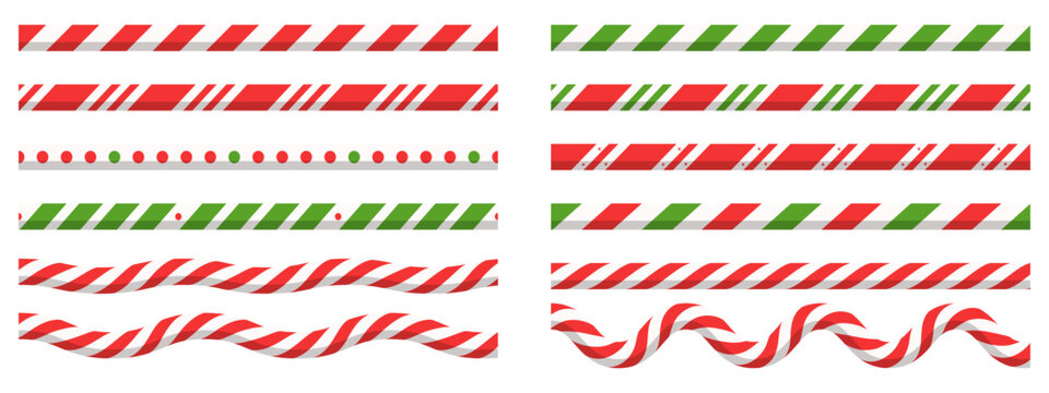 Xmas candy cane line borders. Red and white striped pattern for banners, dividers in lollipop style.