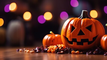 Smiling halloween pumpkin and candies in minimalist style. AI generated