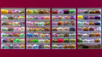 Vintage candy store with rows of glass jars of sweets. Candy shop interior