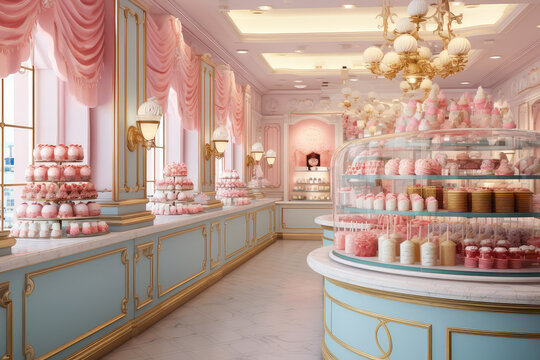 Candy shop empty interior with various pastry, cashier desk, shelf and tables with chocolate, candycanes and lollipops for sale, glass tubes with bubble gum or sweets decor cartoon vector illustration