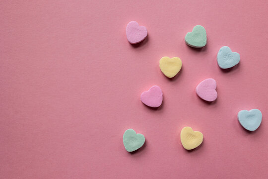 flat lay of scattered pastel colored candy hearts in pink, green, and yellow against a pink background with copy space available; valentines day themed