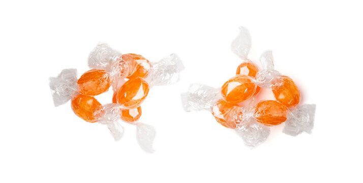 Orange hard candies isolated. Scattered lollipop pile, wrappers fruit confectionery group, round sweets
