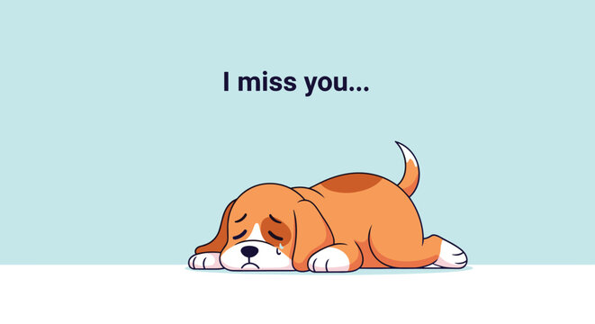 Adorable and sad beagle puppy character lying down on the ground with a tear in its eye and the text I miss you written above it.