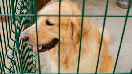Golden retriever behind wires, longing eyes whisper freedom, echoes of Adopt-a-Shelter-Dog Month, canine companionship odyssey awaits