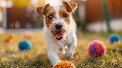 A happy dog playing with toys in a backyard, Enjoying playtime with pet