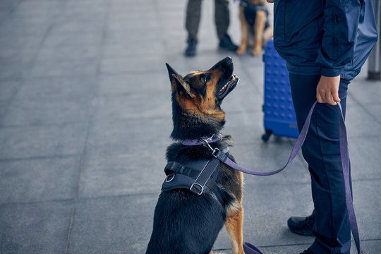 Security guard with German Shepherd police dog patrolling area. Professional K9 unit walking together on duty. Close up view of working dog in action.