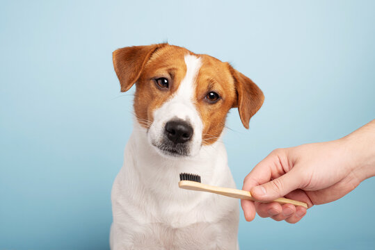 A man brushes his dog's teeth with a toothbrush on a blue background