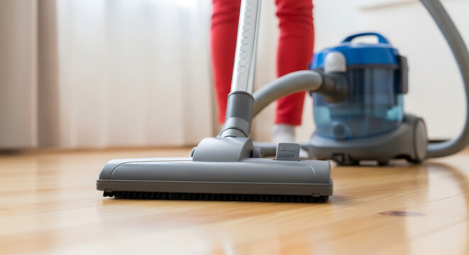 Person in red pants using a canister vacuum cleaner on a wooden floor