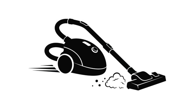 Black and white graphic illustration depicting a canister vacuum cleaner actively sucking up dirt and debris with speed lines indicating motion for cleaning services concept art