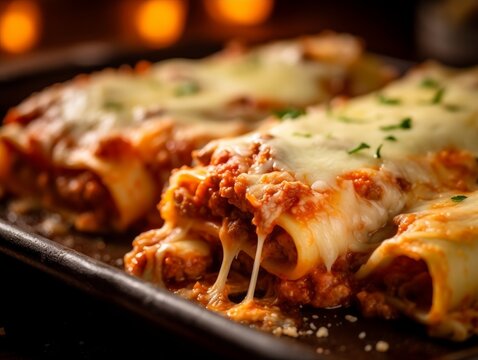 A tempting closeup image presents a serving of seafood cannelloni filled with an enticing combination of succulent shrimp, tender scallops, and flaky white fish, all enveloped in perfectly