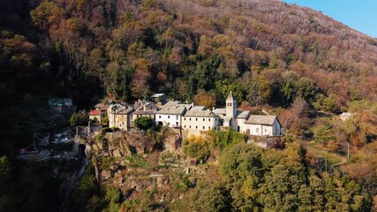 Aerial view of a village with stone buildings and a church nestled on a hill amid colorful autumn foliage, Carmine Superiore, Piedmont, Italy.