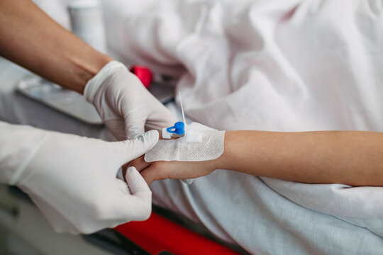 Close up of nurse insering IV cannula in little girl hand. IV, intravenous therapy for child patient.