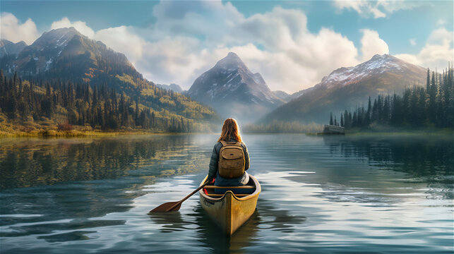 canoeist driving lonely through deserted dreamlike lake landscape with mountains in background, generative AI
