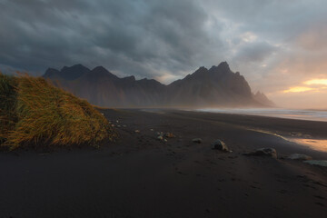 Sunrise on dramatic beach in Iceland surrounded by mountains