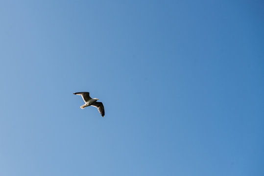 Seagull flies placidly over the sea on a clear day.