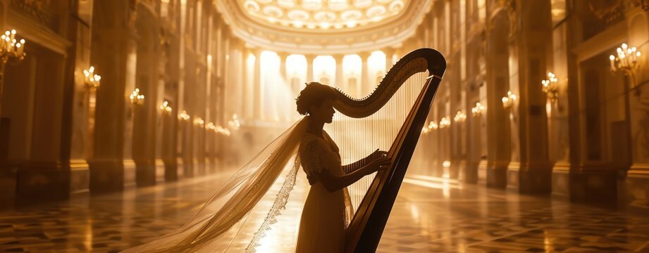 playing a harp in an elegant hall, with soft light illuminating the instrument and the musician